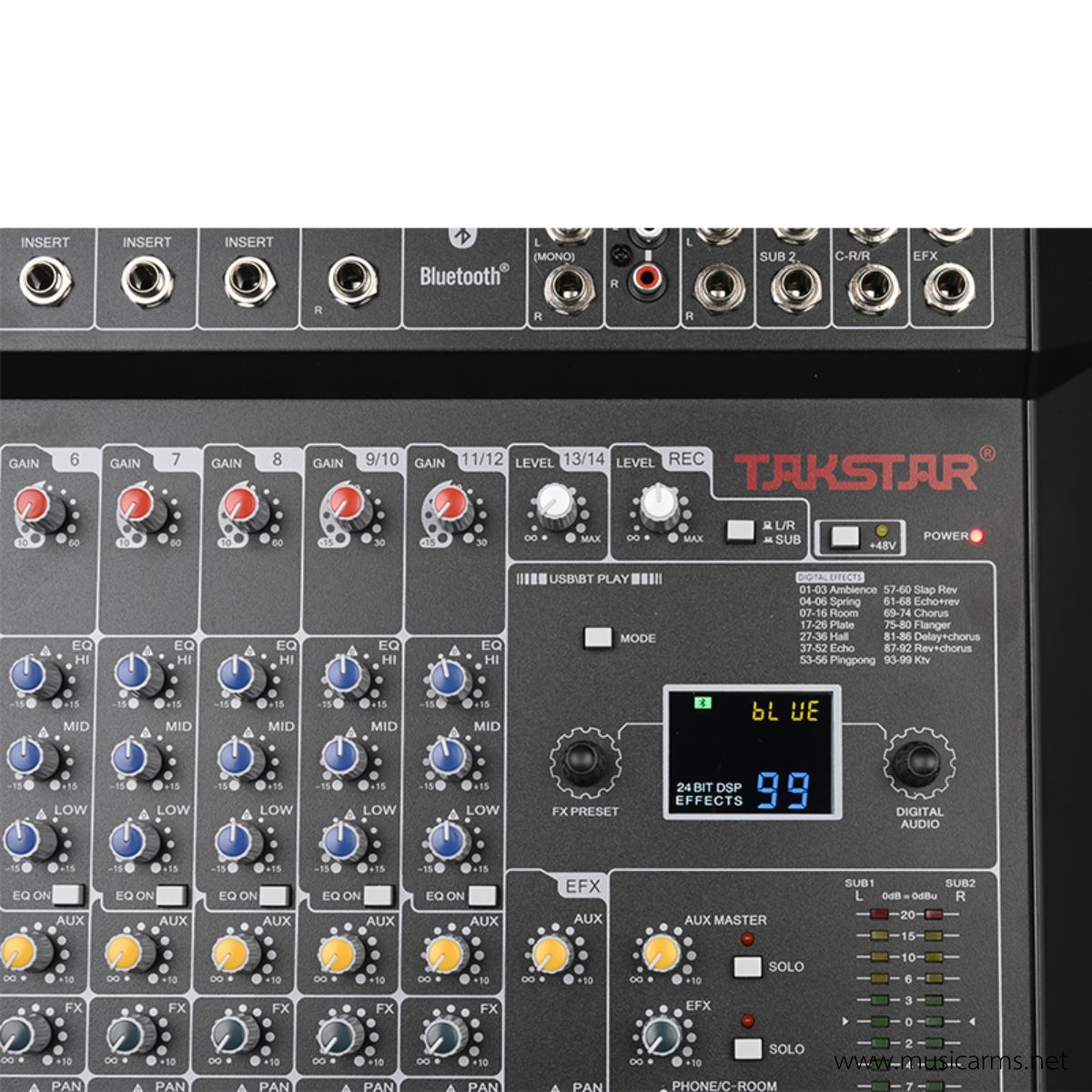 Phantom Power +48V: มีสวิตช์จ่ายไฟเลี้ยงสำหรับไมโครโฟนคอนเดนเซอร์ (Condenser Microphone)