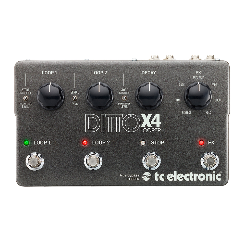 TC Electronic Ditto X4 Looper เอฟเฟค Loop ที่มือกีต้าร์หลายคนถวิลหา โดยรุ่นนี้จะเพิ่มช่องเสียบกีต้าร์สำหรับ 4 ตัวมาให้ ทำให้มือกีต้าร์เล่นพร้อมกันได้อย่างไม่มีปัญหา เรื่องเสียงยังมีทั้งแบบสเตอริโอและแบบ Mono ให้ใช้งาน สามารถเล่น Loop ได้นานถึง 5 นาที เป็นระบบอนาล็อคที่ให้มิติซาวด์กีต้าร์สมบูรณ์แบบ สามารถบันทึกเสียงโดยไม่บีบอัดได้ในแบบ 24 บิท จึงได้คุณภาพเสียงที่ชัดเจนทุกตัวโน๊ต สามารถควบคุมระดับได้จากปุ่มคอนโทรลหน้าเอฟเฟคโดยตรง มีระบบ Bypass ช่วยถนอมการใช้งานเอฟเฟค แป้นเหยียบขนาดเล็กใช้งานง่าย เชื่อมต่อเข้ากับคอมพิวเตอร์ผ่าน USB ได้ งานนี้ครบเครื่องสำหรับมือกีต้าร์อย่างแท้จริง