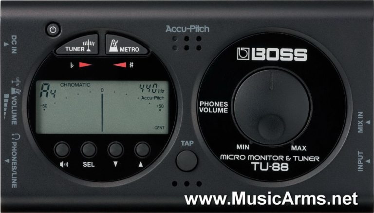 TU-88 Tuners/Metronomes Boss – TU-88: Micro จอภาพและจูนเนอร์ สามฟังก์ชั่นการตรวจสอบ / จูนเนอร์สำหรับกีตาร์และเบส ขนาดเล็ก และคุณลักษณะที่บรรจุลง BOSS ใหม่ TU-88 จะต้องมีสำหรับนักกีตาร์และเบสผู้เล่นดนตรีที่มักชอบเดินทาง มีสีดำหรือสีขาวก็มีการปรับจูนเข็มที่ถูกต้องเมโตรนอมและแอมป์หูฟังที่มีลำโพงจำลองสำหรับการตรวจสอบขนาดกะทัดรัด