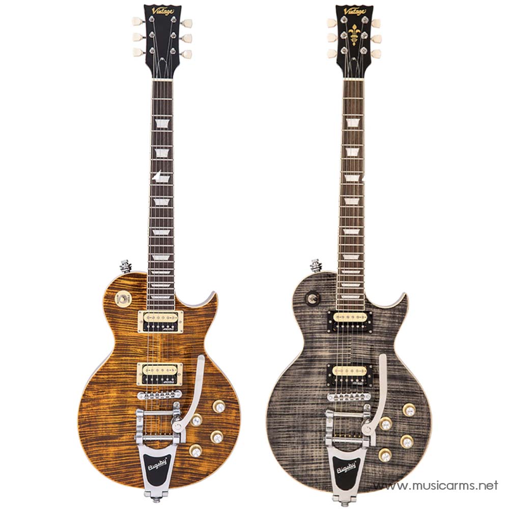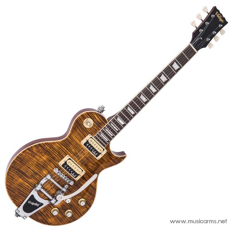 Vintage V100 ReIssued With Bigsby กีตาร์ไฟฟ้าอีกหนึ่งรุ่นที่ขายดีของ Vintage โดดเด่นด้วยหางปลาแบบ Bigsby vibrato ที่สร้างจากอะลูมิเนียมหล่อขึ้นรูป เพื่อความทนทานสูงสุดและคุณภาพโทนเสียงที่เหนือกว่า บอดี้เป็นไม้มมะฮอกกานีปะหน้าด้วยไม้เฟลมเมเปิลให้โทนเสียงมีมิติ คอไม้มะฮอกกานีชิ้นเดียวและฟิงเกอร์บอร์ดโรสวูด มอบความสามารถในการเล่นที่เหนือชั้นและการผสมผสานไม้โทนที่สมบูรณ์แบบเสริมด้วยปิ๊กอัพ Wilkinson WVHZ Double Coils ให่สไตล์โทนเสียงที่ดุดันตอบรับทุกแนวดนตรี งานดีครบเครื่องแบบนี้จึงไม่แปลกที่จะติดอันดันท็อปในรุ่นยอดนิยม