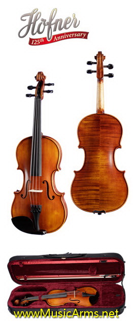 Hofner AS-260 Violin Size 4/4 ฮอฟเนอร์ ไวโอลิน -เป็นไวโอลินที่ด้านหน้าเป็นไม้สนแมนจูเรียนสปรูซแบบ Solid , ด้านหลังและด้านข้าง ไม้หิมาลายันเมเปิ้ล ลาย flamedผิวสีน้ำตาลทับทิม ฟิตติ้งไม้อีโบนีบริดจ์ไม้เมเปิ้ลสายโลหะขัดเงามาพร้อมคันชักไม้บราซิลวู้ดแปดเหลี่ยม ฟร็อกไม้อีโบนี, ยางสน,และกล่องใส่ทรงสี่เหลี่ยมผืนผ้า