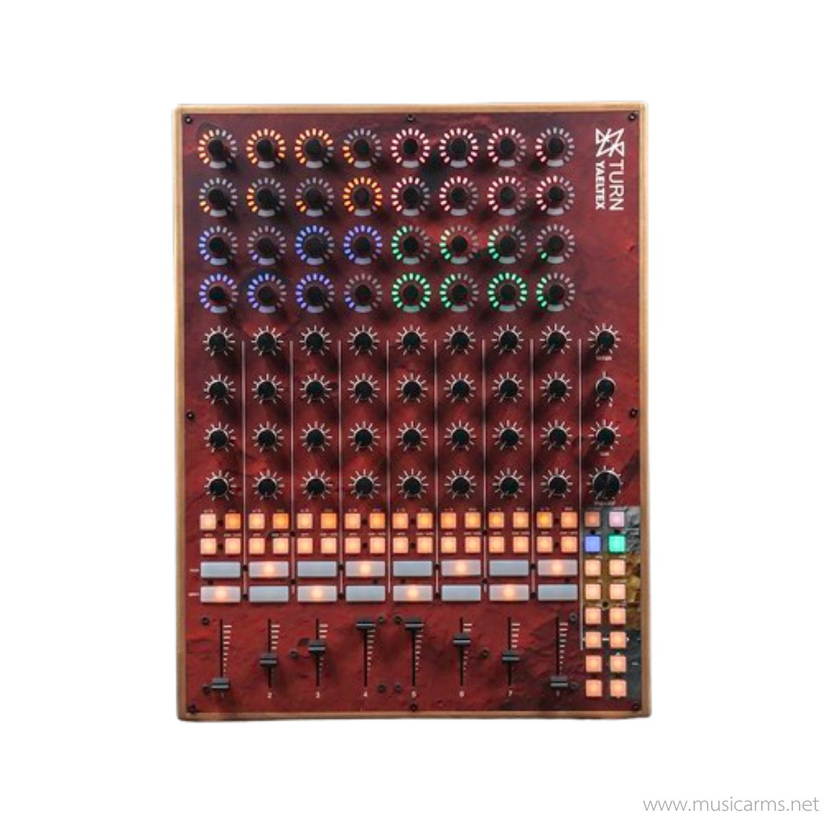 Yaeltex Turn คือ MIDI Controller งานแฮนด์เมดจากไม้แท้ (Patagonian Wood) ที่ออกแบบมาเพื่อเป็นส่วนเติมเต็มให้กับ Ableton Push หรือใช้งานเป็น Mixer อิสระ มาพร้อมเลย์เอาต์แบบ 8 Channel Strip ที่ครบครันด้วย Encoders แบบหมุนไม่จำกัดรอบพร้อมไฟ RGB, ปุ่มกด, และ Fader ให้คุณควบคุม Volume, Pan, Sends และ Device Parameters ได้อย่างละเอียดและสวยงาม