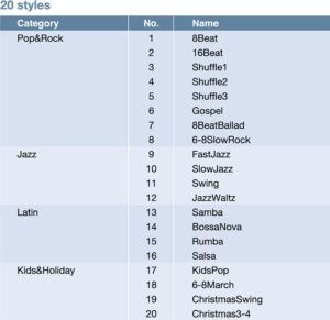 P-125 มีแทร็กเสียงกลองและเบสในตัว มีรูปแบบจังหวะหลากหลายรูปแบบให้เลือกขึ้นอยู่กับกลิ่นอายที่คุณต้องการ จากเพลงร็อคถึงเพลงบัลลาด ใช้จังหวะเหล่านี้เพื่อเพิ่มองค์ประกอบของความสนุกสนานในการฝึกซ้อมของคุณ หรือเป็นมือกลองสำหรับการแสดงของคุณ