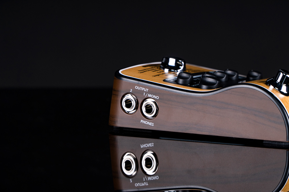 - Two ¼” outputs for mono or stereo connection to guitar amps, headphones,and audio interfaces